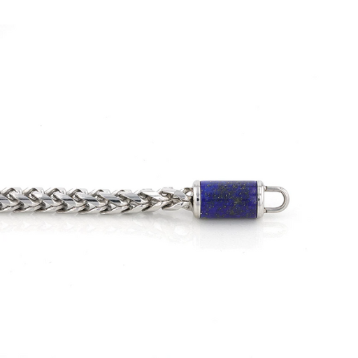 The woven stainless steel chain delivers durability and strength, symbolizing confidence and resilience, while the deep blue lapis inlay adds a touch of luxury and individuality. Designed at a 9-inch length, this bracelet provides a comfortable, masculine fit that complements both casual and formal looks.