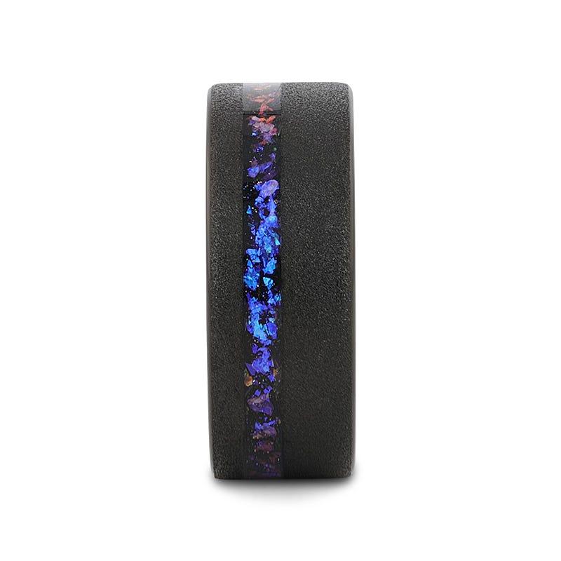 Experience the mesmerizing allure of the MIRAGE Sandblasted Black Tungsten Ring with Alexandrite & Dark Blue & Purple Crushed Goldstone Inlay. This exceptional ring merges contemporary craftsmanship with enchanting gemstones to create a piece that captivates with every glance.
