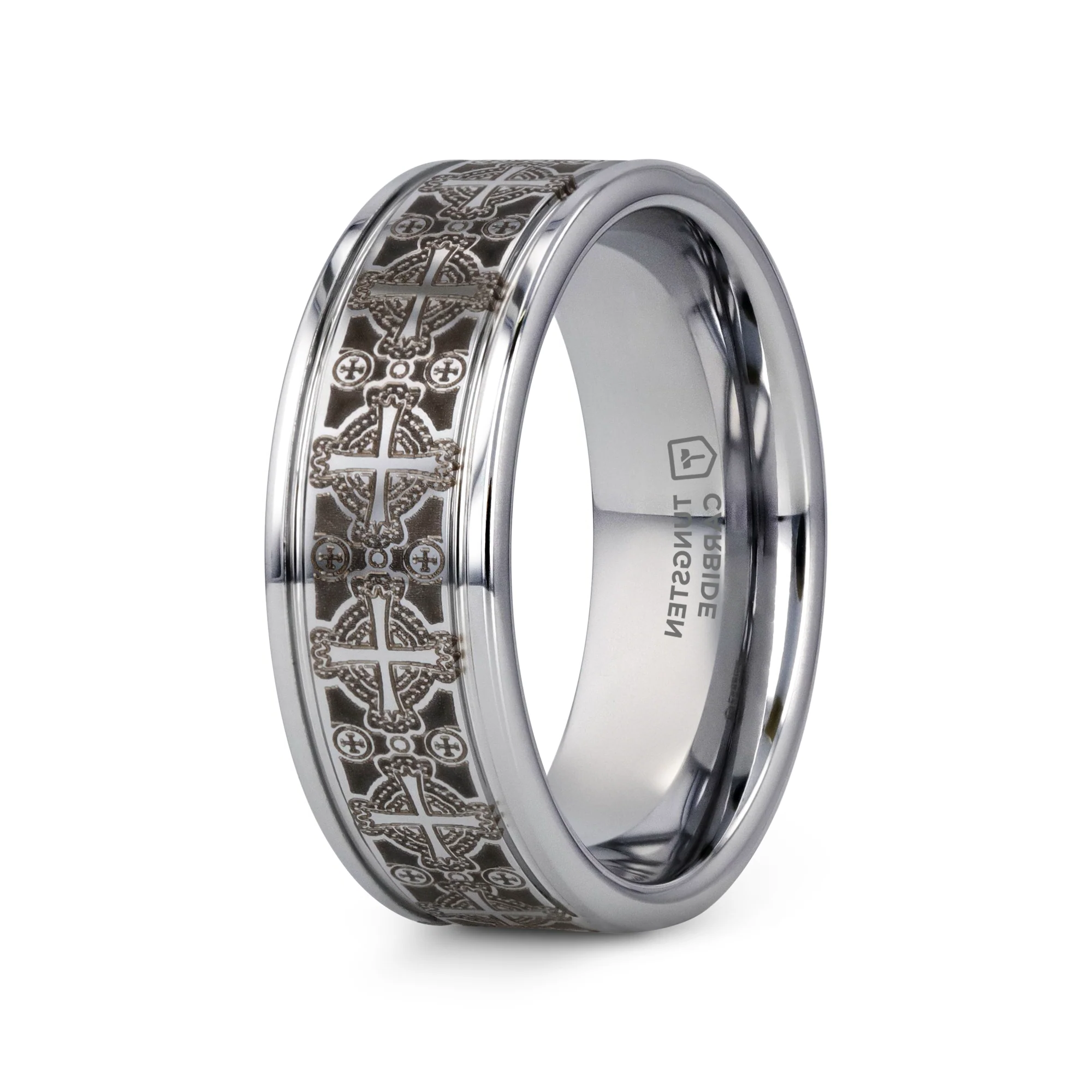 The Deacon Flat Tungsten Ring Laser Engraved Celtic Crosses 8mm