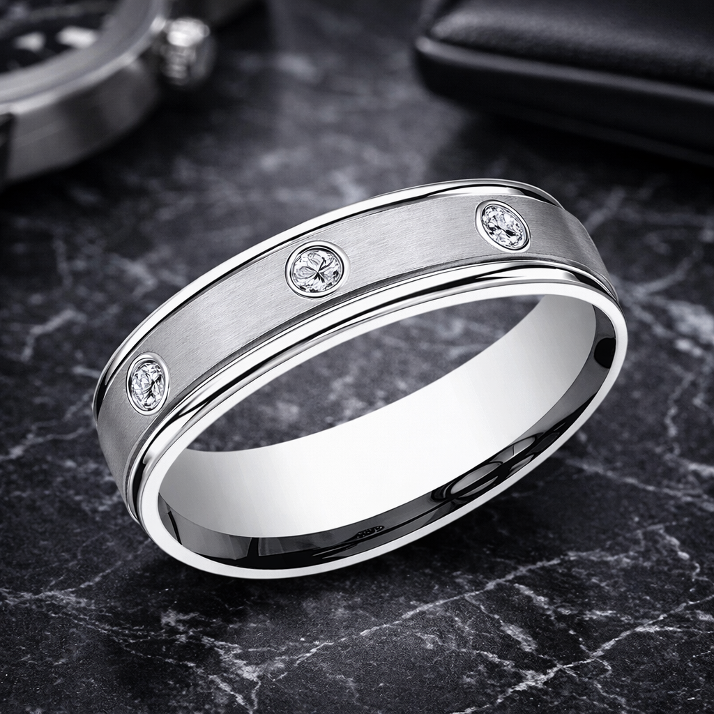 The Langston is refined, luminous, and artfully balanced. Crafted from 950 platinum, this 6mm men’s wedding band features a smooth satin-brushed finish that exudes subtle sophistication, bordered by polished beveled edges for a touch of classic shine. Along the band, eight bezel-set diamonds, each 0.04 carats, are evenly spaced to create a rhythm of brilliance that’s understated yet undeniably striking.