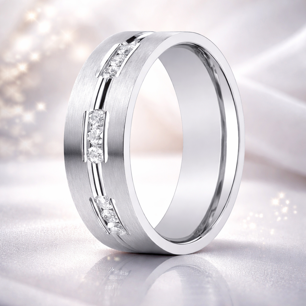 The Sterling is a celebration of refined brilliance and enduring love. Crafted in lustrous 14K white gold, this 6mm wedding band features a sleek flat profile with a soft satin finish and a center-cut channel housing nine sparkling diamonds (0.18ct total). Each 2-point diamond is securely channel-set, creating a continuous line of subtle shimmer and timeless elegance.
