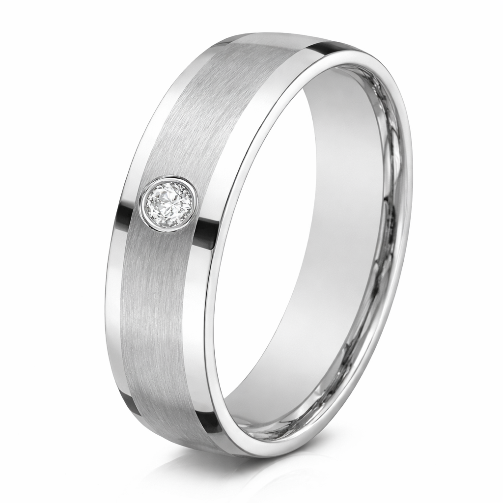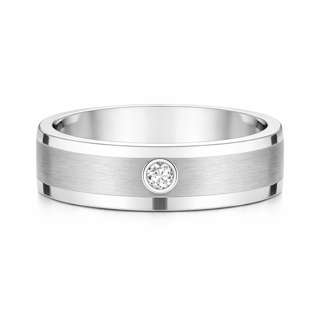 The Alexander is a statement of quiet confidence and enduring elegance. Crafted in rich 14K white gold, this 6mm men’s band features a smooth satin finish that exudes understated sophistication. At its center, a single 8-point diamond adds just the right amount of brilliance—symbolizing strength, clarity, and lasting commitment.