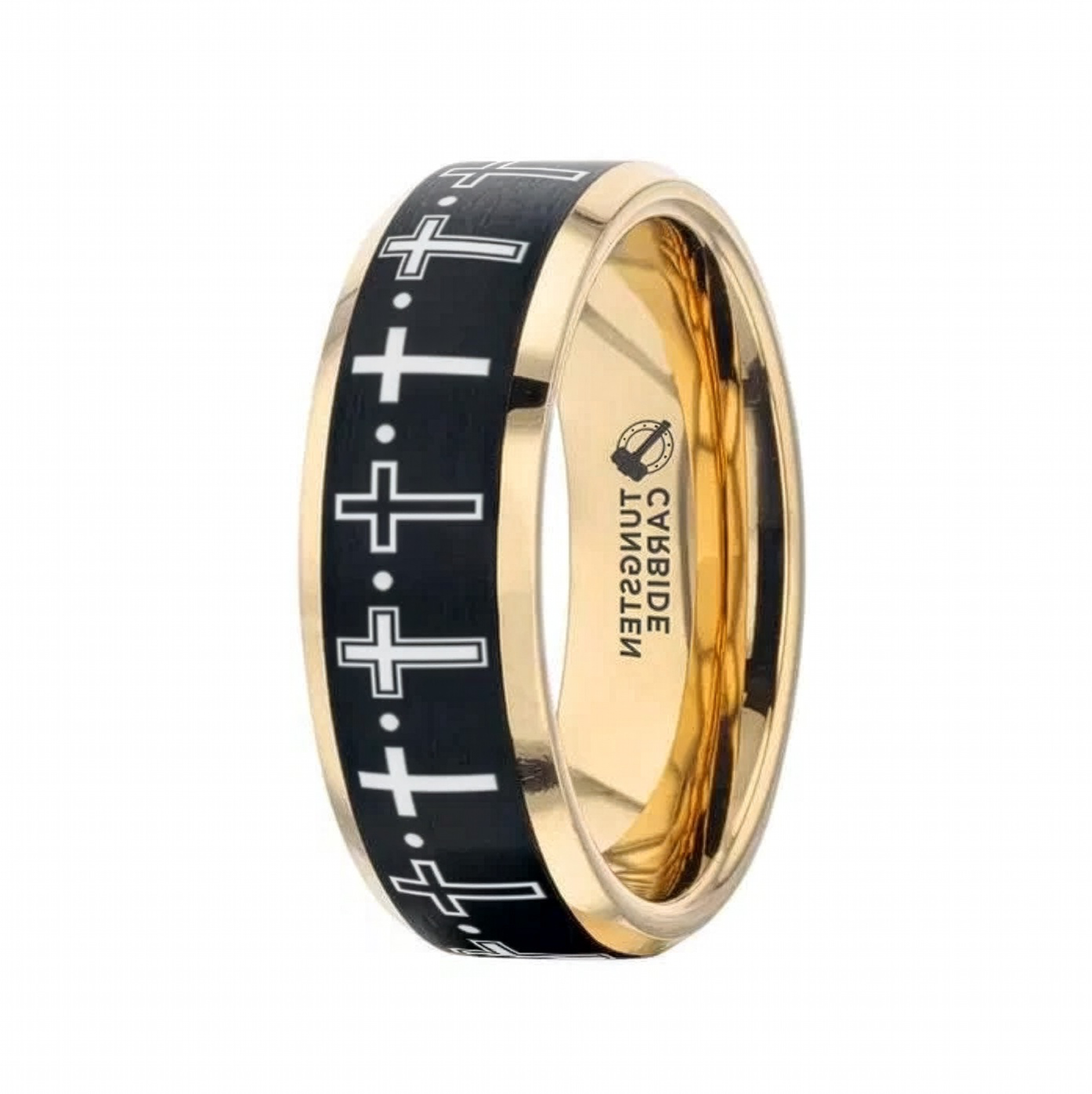 The Faith Cross Engraved Gold Plated Tungsten Ring with Brushed Black Center 8mm