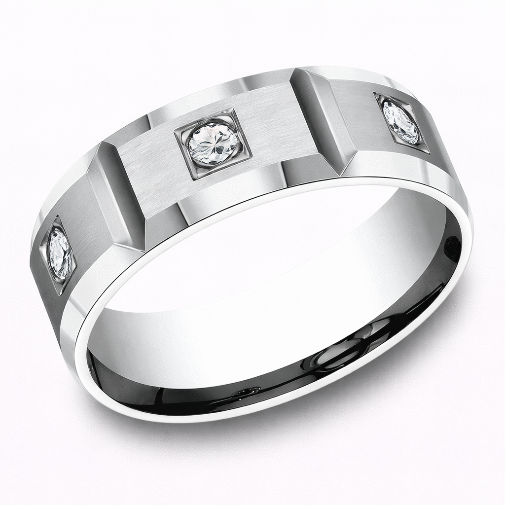 The Chancellor is commanding, detailed, and brilliantly composed. Forged from 950 platinum, this 8mm wedding band features a satin-brushed finish that softens the surface with a modern matte texture, framed by sleek polished beveled edges for contrast and definition. Along the band, six 0.08 carat diamonds (totaling 0.48 carats) are burnish-set into precisely cut grooves, adding brilliance and architectural depth without overpowering the clean design.