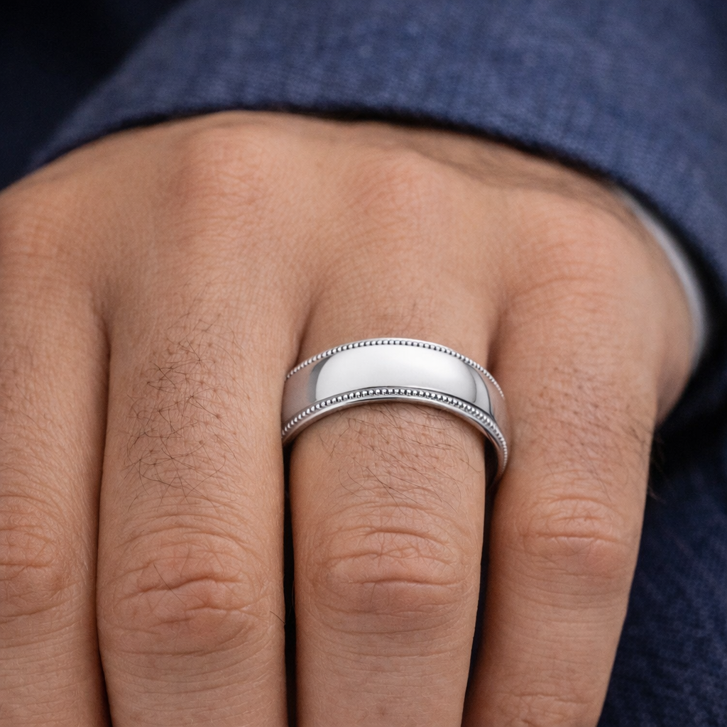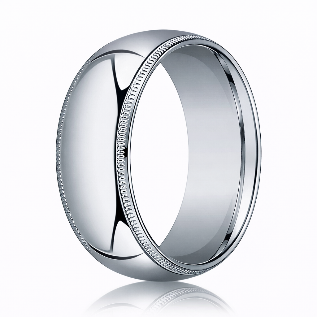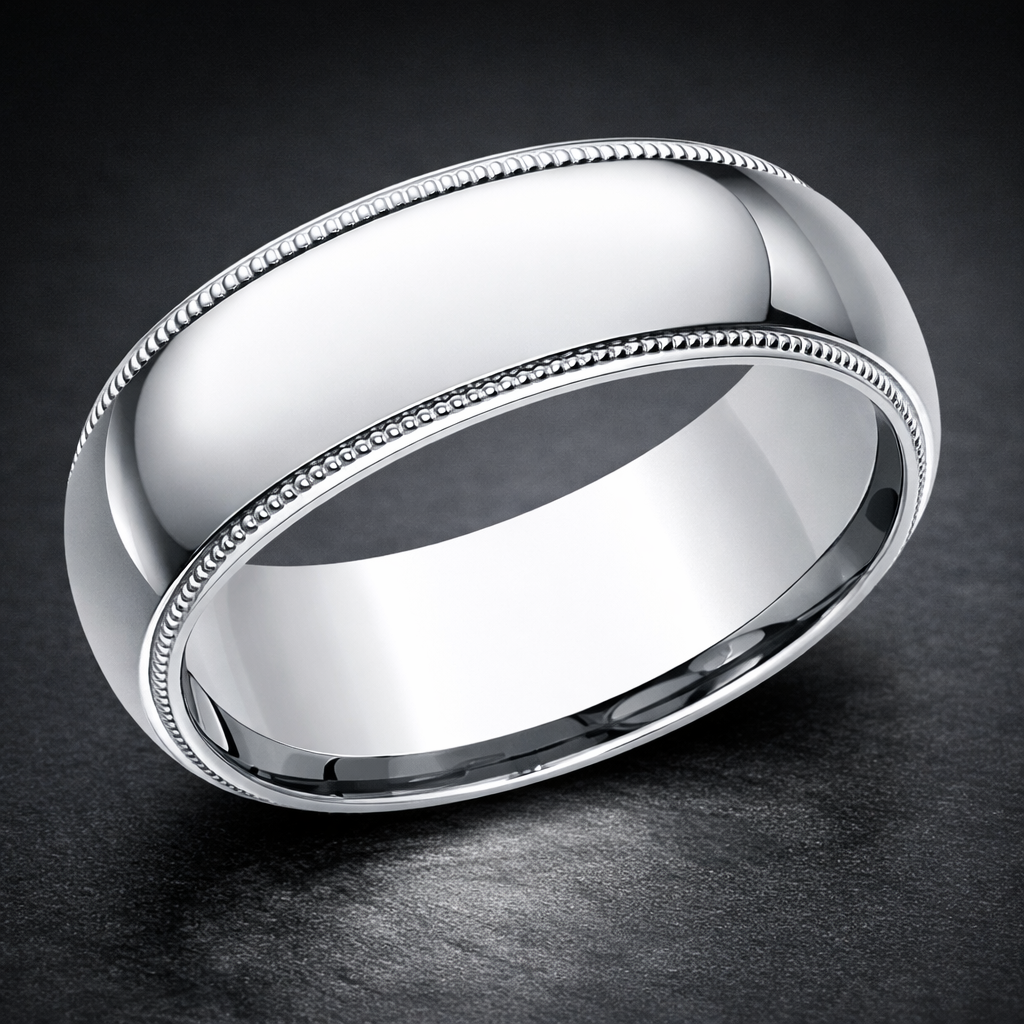 The Milgrain Crest pairs cool white‑gold luster with vintage edgework. Cast from solid 18 K white gold, this broad 8 mm men’s wedding band shines with a mirror‑bright polish, then frames that surface with twin rows of fine milgrain beading. The dotted borders add heritage texture without cluttering the clean silhouette, while the substantial width gives the ring a confident, refined presence.