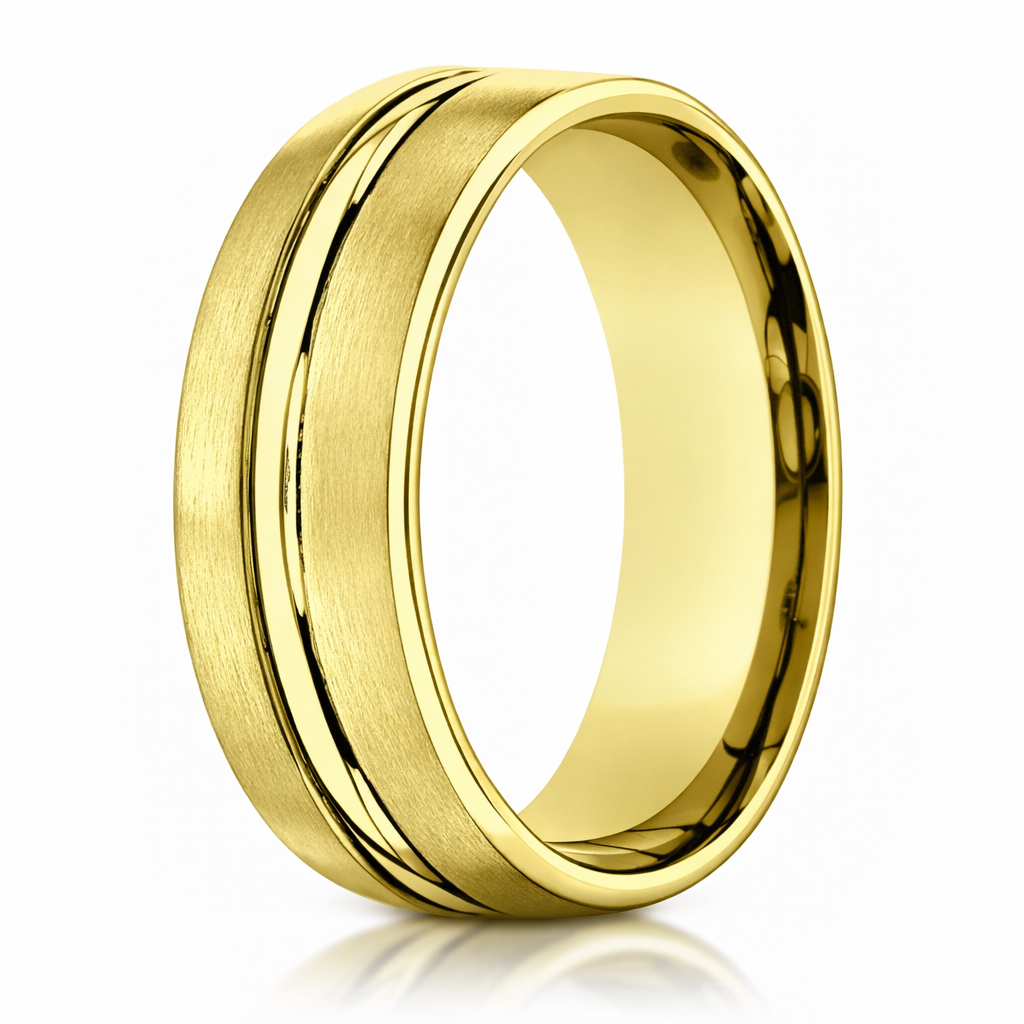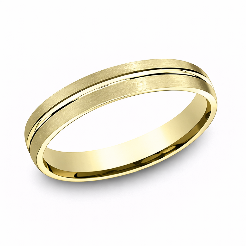 The Twin Gleam pairs bright polish with a soft matte frame. Forged from solid 18 K yellow gold, this slim 4 mm men’s band features a mirror‑finish center stripe bordered by satin‑brushed edges, giving the ring two distinct “gleams” of contrast without adding bulk. The narrow profile feels light and easy to wear, and the comfort‑fit interior helps the band glide on smoothly and stay comfortable from morning routines to evening celebrations.