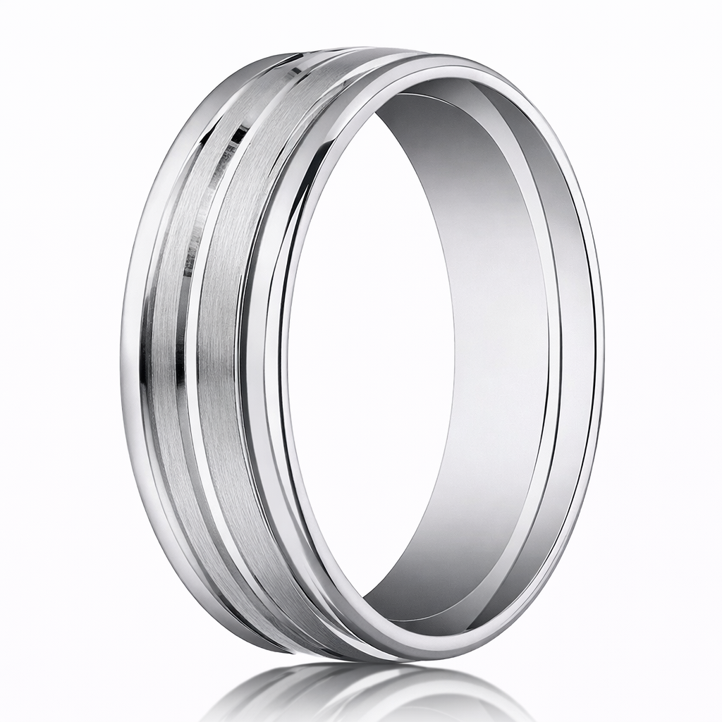 The Frost Edge balances cool luster with a crisp flash of shine. Forged from solid 18 K white gold, this slim 4 mm band sets a satin‑brushed center against polished edges, creating a subtle line of contrast that stays sleek and understated. The lightweight profile feels effortless on the finger, while a comfort‑fit interior lets the ring glide on smoothly and sit comfortably from everyday routines to milestone celebrations.