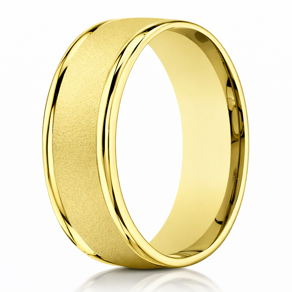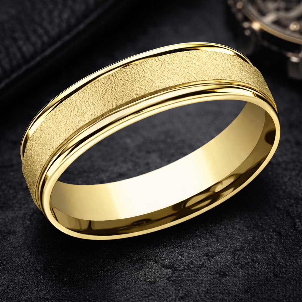 The Dune is where understated texture meets warm, timeless gold. Cast in solid 18 K yellow gold, this 6 mm men’s wedding band is finished with a fine sand‑blasted surface that diffuses light into a soft, matte glow—luxurious without being flashy. Polished edges frame the center for a clean outline, while the comfort‑fit interior lets the ring slide on easily and stay comfortable through long workdays and milestone celebrations alike.
