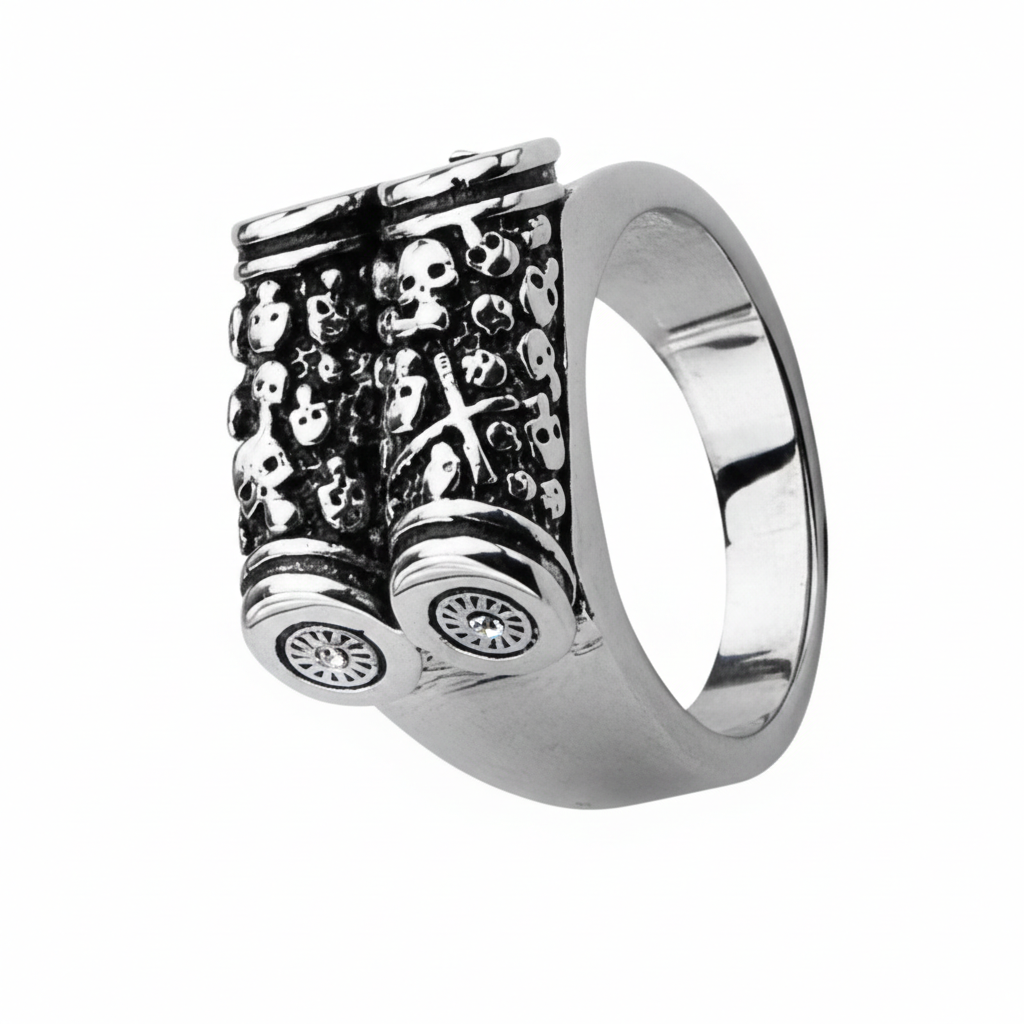 The Scroll is a fusion of mechanical edge and gothic intensity. Crafted from durable stainless steel, this 18mm traditional-fit ring features a bold etched skull at its center, framed by two raised cylinder-like bars that evoke industrial strength. The detailed engravings add a sense of worn, aged grit, while the polished and oxidized finish enhances contrast and brings depth to every line. With its hefty profile and precise craftsmanship, this ring delivers both attitude and artistry.