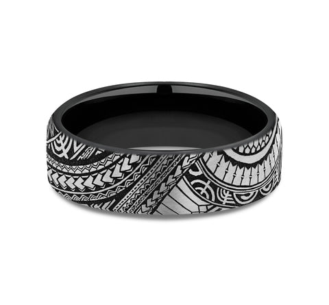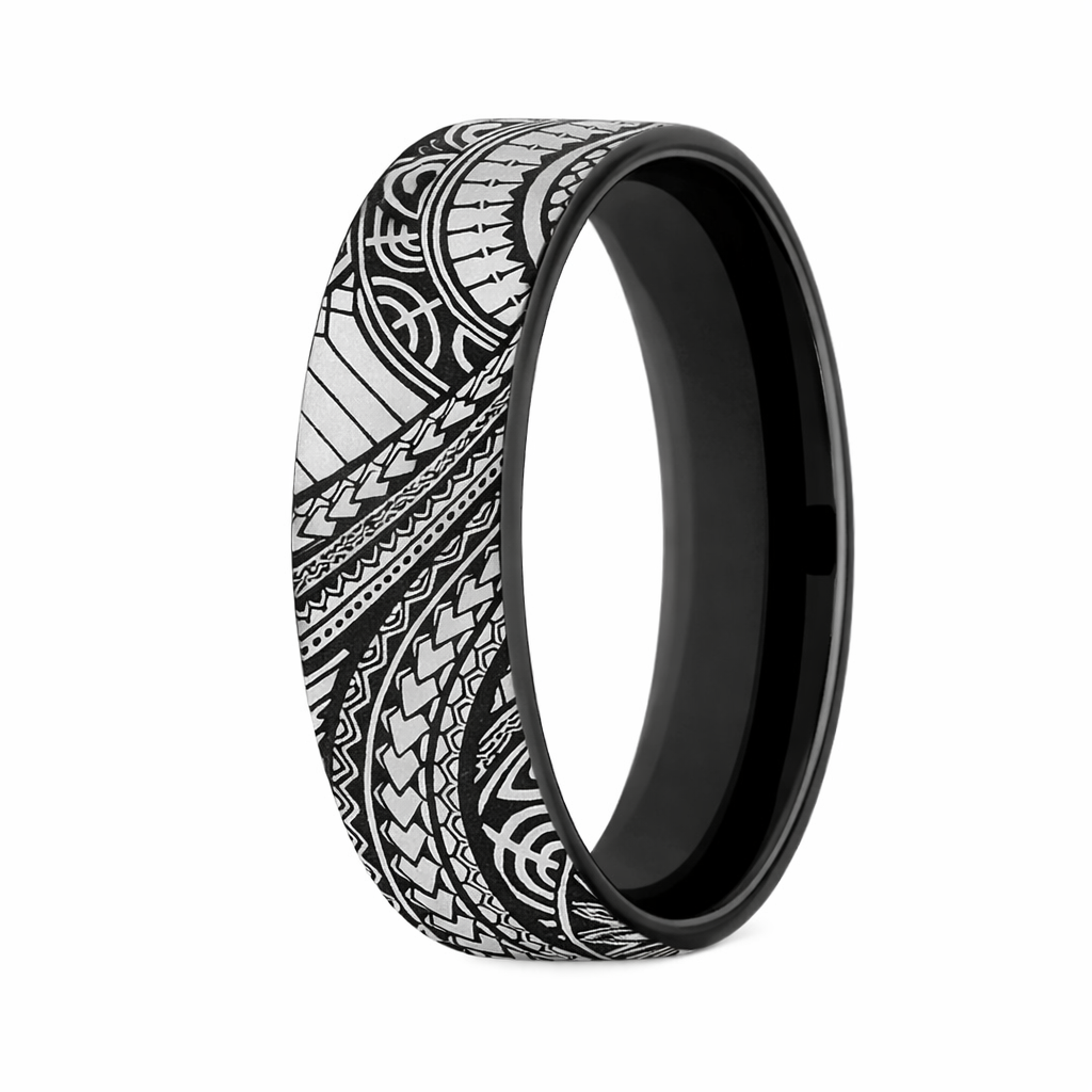 The Polynesian is a bold expression of heritage, strength, and modern craftsmanship. This 6.5mm men’s ring is crafted from lightweight, durable black and grey titanium and features a detailed Polynesian-inspired pattern that wraps the band with powerful symbolism. The Euro Comfort Fit ensures a smooth, secure feel, making it ideal for everyday wear.